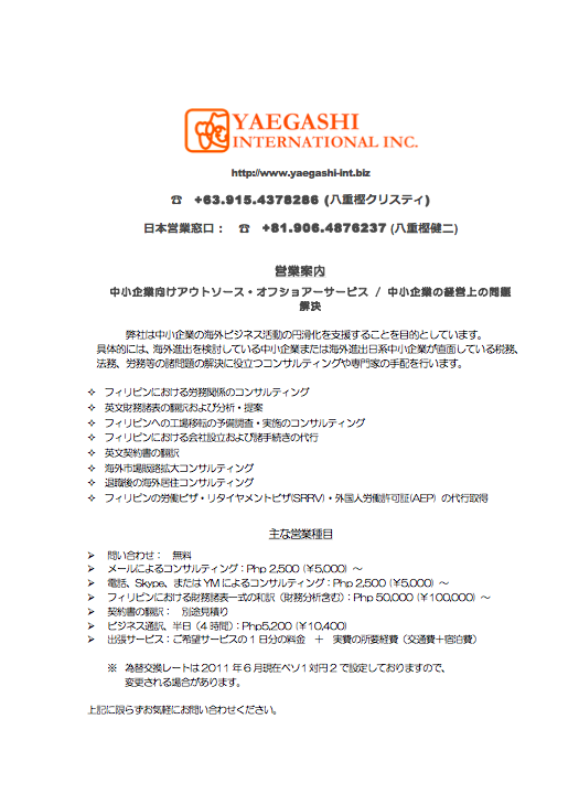 フィリピンに進出している日系企業において、文化、言葉、習慣等が異なる労働者を使用するのは最も骨の折れる仕事の一つだと思います。特に、賃金、手当および休日ついては、日本人経営者、工場長、およびマネージャが気を付けて取り扱う必要があります。そこで本書をいつも手元において、活用してくださるよう願っています。